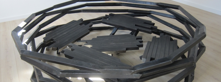La suite de l’exposition est ponctuée de sculptures en acier noir dont certaines sont en vis-à-vis de dessins ou de peintures composées de lignes noires sur fond blanc. Toutes portent des noms étranges qu’il ne faut pas craindre de prononcer à haute voix pour mieux imaginer la personnalité de chaque sculpture. Par exemple la pièce intitulée ROMAROUM composée de six cercles… difficile de se retenir de rouler les « r » !